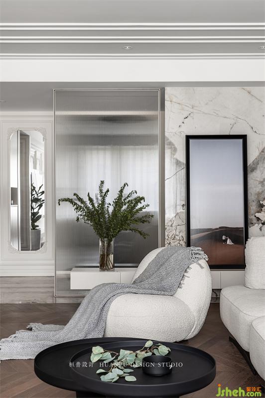 由于業(yè)主熱衷于不同的材質(zhì)拼接,所以玄關(guān)處的地板選用的是大理石,而客廳選用的是木地板。其之間還用了屏風(fēng)和連紋巖板進(jìn)行隔斷,分割成了兩個(gè)獨(dú)立的空間。在挑選屏風(fēng)時(shí)選擇了長虹玻璃,可以優(yōu)化玄關(guān)的采光,增加了室內(nèi)的朦朧美感。同時(shí)增加了空間的通透感,但也保留了一絲神秘感。