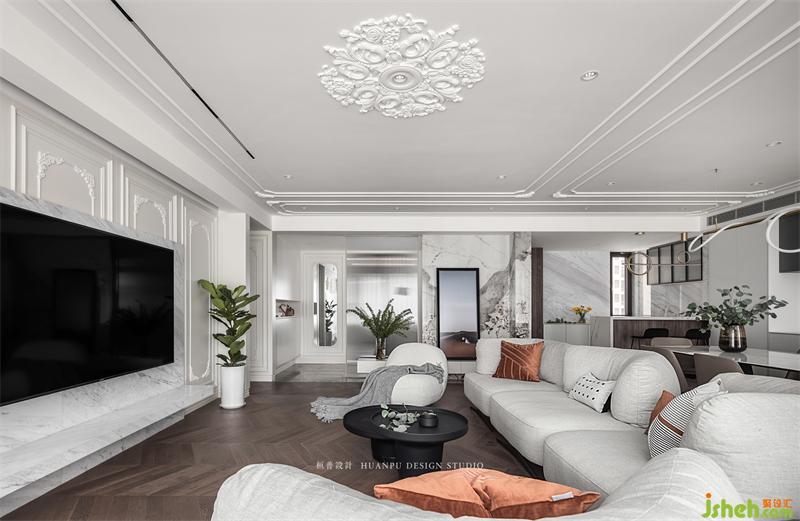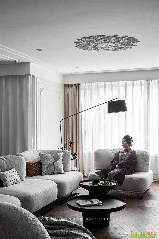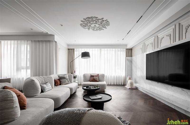 主燈使用石膏訂做的雕花燈座是客廳的點(diǎn)睛之筆,無論從哪個(gè)角度看都能感到滿滿的法式浪漫氣息。
