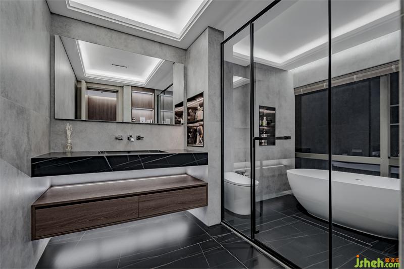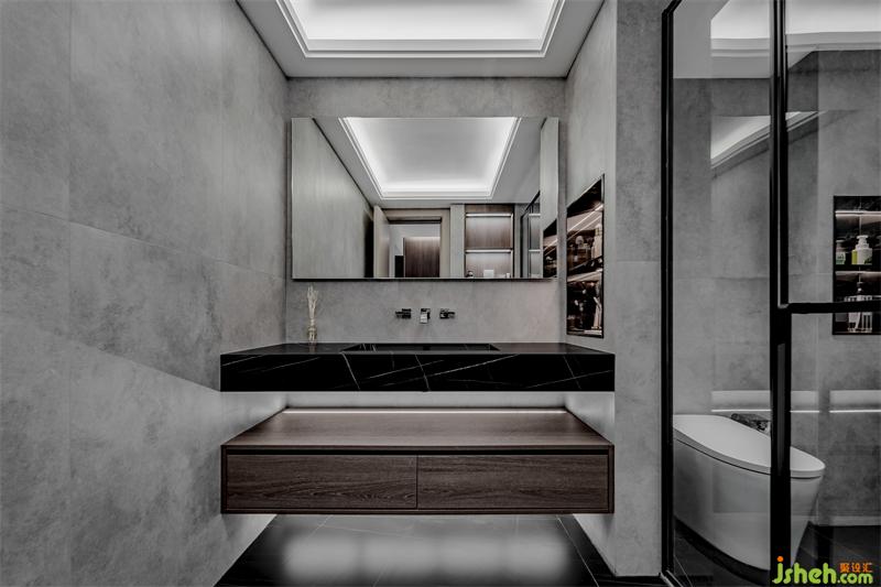 次衛(wèi)采用干濕分離,盥洗區(qū)分體盆用的是黑色巖板,與灰色墻面相輔相成。這里的盥洗盆用的是暗埋龍頭,這個“盆”不像傳統(tǒng)盥洗盆能儲水,因為它是一個斜面,看起來更加精致漂亮。干區(qū)濕區(qū)都有設(shè)計壁龕,可以放置洗浴用品和護膚品。