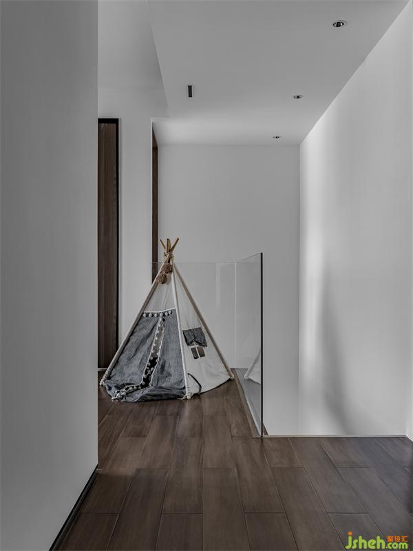 父母房使用了大量木飾面,床頭設(shè)置了氛圍燈,營造出溫馨舒適的休息環(huán)境。入門處有一扇小小的格柵,有一定的設(shè)計感,還能為居住者帶來稍許安全感。門旁邊還有一個步入式小型衣帽間,方便衣物收納。
