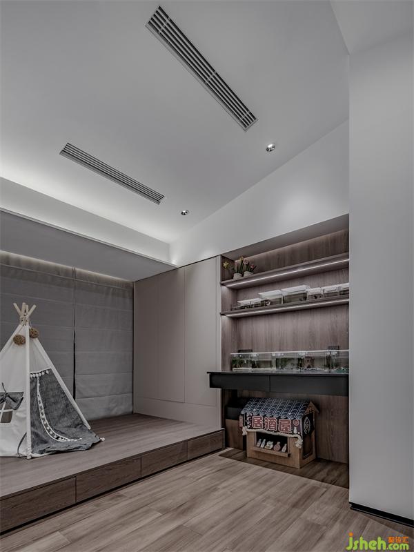 業(yè)主把這里暫時作為貓房,養(yǎng)了兩只非常可愛的小貓。這個天花特地做成了小屋頂?shù)母杏X,有點童趣感,設(shè)計靈感源自于他們兩在美國留學(xué)時的閣樓,以后也可作為兒童房的備用。我們還做了一個榻榻米的家居設(shè)計,木板底下是抽拉式儲物抽屜,目前是拿來放置貓貓使用的物品。邊上的展示柜拿來放業(yè)主的另一群寵物——寄居蟹,簡直就是動物的天堂。