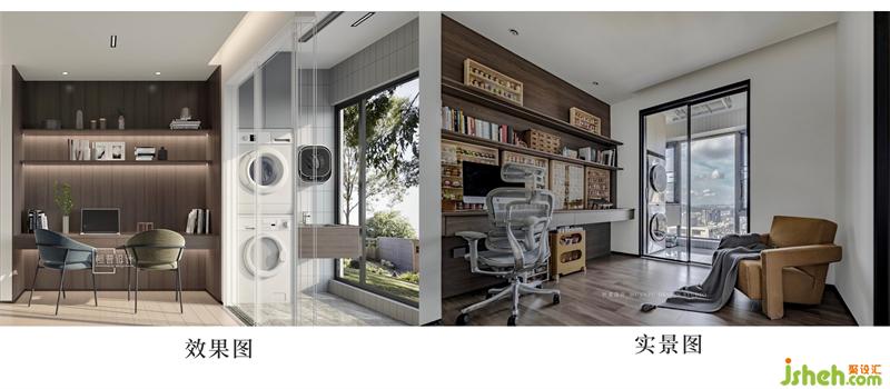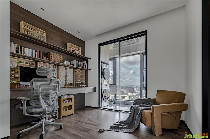 從樓梯一上來就可以看到這個開放式書房,首映眼簾的就是女主人的盲盒墻,為簡潔的空間帶來了一抹可愛色彩。書房旁有個生活陽臺,不僅有洗衣機烘干機,還有自動晾衣架。滿足了日常盥洗需求,同時也增加了書房的無限采光。