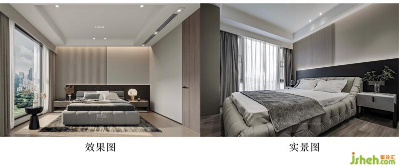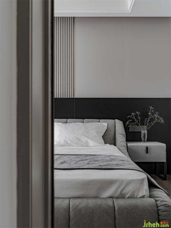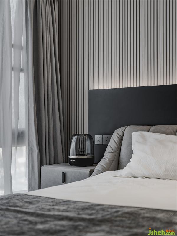 主臥床頭做了一個(gè)格柵板與黑色巖板的拼接,設(shè)計(jì)感滿滿。暗藏?zé)魩Ыo臥室?guī)矸諊?,增添舒適度。床對(duì)面還做了一個(gè)可伸縮投影幕布,在床上看電影真的太舒服了。
