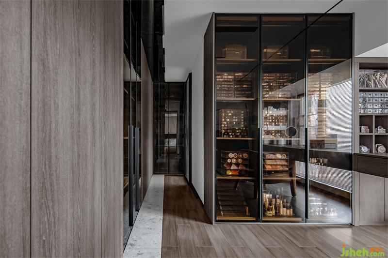 入門左側(cè)是一排柜子,包括隱藏木柜和亞克力展示柜。一路走到盡頭可以看到亞克力展示柜里放著女主人華麗的包包,還有男主人擺放整齊的球鞋。簡(jiǎn)直就是收納界的明星陣容,好看又實(shí)用!