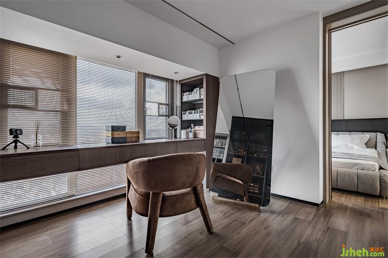 本次案例亮點(diǎn)莫過于是主臥的超級(jí)衣帽間,進(jìn)門右側(cè)是一張長(zhǎng)條化妝桌??雌饋砥狡綗o奇,其實(shí)這張桌是一種翻蓋式梳妝臺(tái)。打開之后有一面帶燈的鏡子,而桌子內(nèi)部就是可以放置日常會(huì)使用到的化妝工具和化妝品。