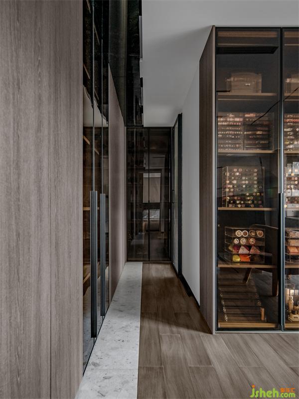 書房對(duì)著的就是一個(gè)小型水吧,業(yè)主特別喜歡這個(gè)像音箱的小冰箱。它作為一個(gè)冰箱,除了可以冷藏,還能起到一個(gè)裝飾的作用??梢钥吹接写竺嬲故竟?,主要是放置紅酒香檳等。工作學(xué)習(xí)之余,還能在這小酌一杯,真是浪漫人生的愜意瞬間。