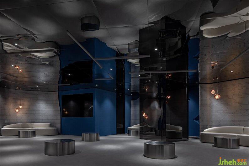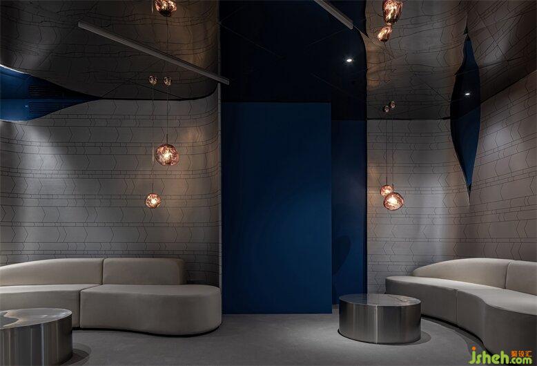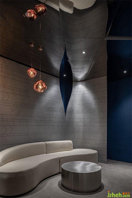 In the lobby, the stacked azure blue rainbow glass undulates like ocean waves, reflecting the light into a shimmering mirage; the winding front desk is glowing with metallic luster, as if it is flowing slowly. With a quick glance, the mood seems to have reached the estuary and precipitated a calm coolness.There are two huge overlapping ring installations on the ceiling. The simple sequence enhances the texture of the space, and adds a sense of ritual and mystery at the same time, which implies that there are infinite possibilities hiddenrighthere, and the unrevealed surprises remain tantalizing.
