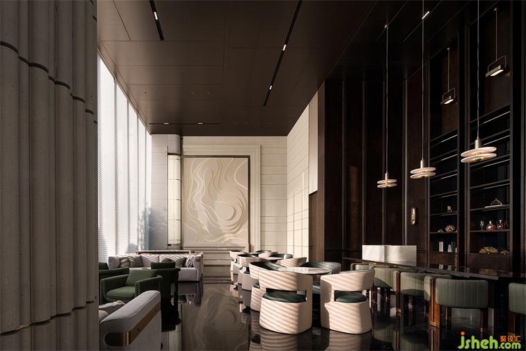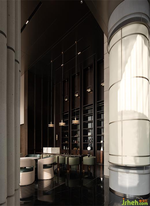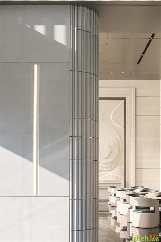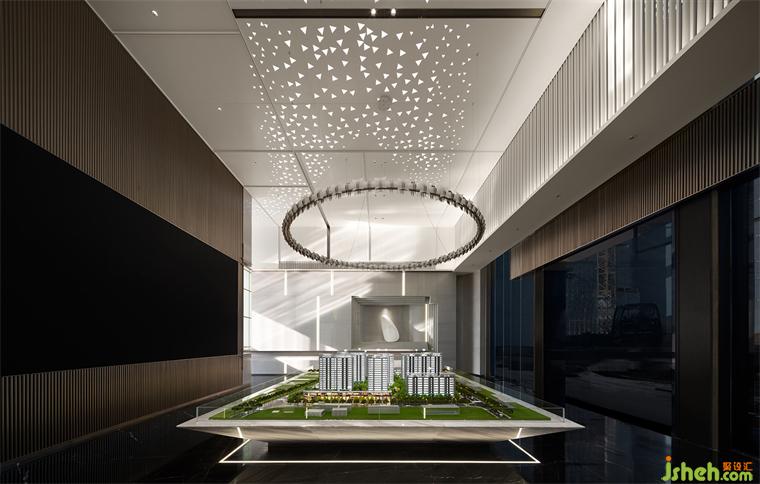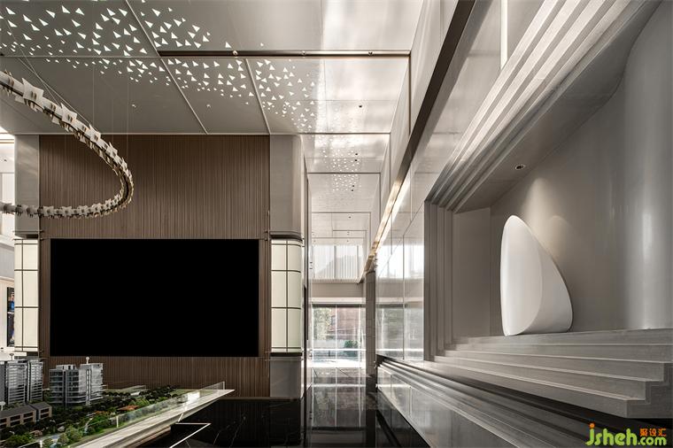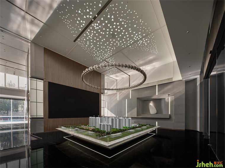 由前廳進(jìn)入,繞行接待區(qū),沙盤區(qū)端明簡(jiǎn)潔,環(huán)形燈向下籠罩城市方舟,立面肌理與石材紋理為簡(jiǎn)潔注入細(xì)膩,售樓處設(shè)計(jì)奢華感與藝術(shù)氛圍的交融由此可見(jiàn)。