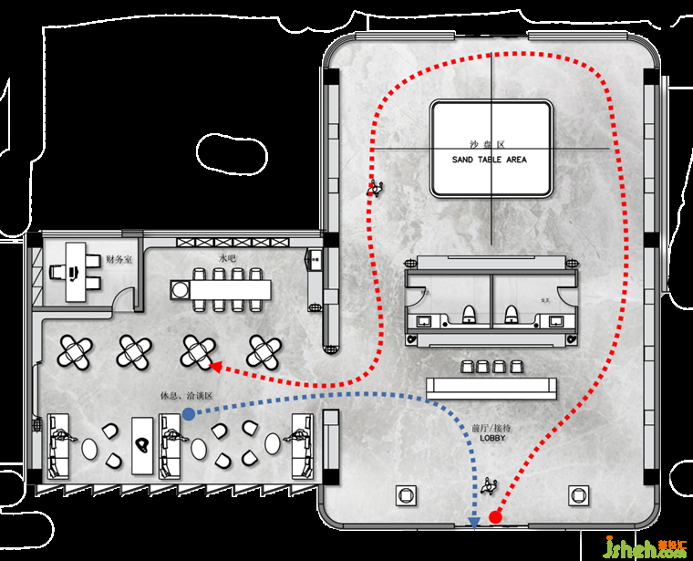 從前廳繞行沙盤區(qū)后進(jìn)入敞開的綜合洽談休閑區(qū),最后由此快速返回,形成一條不重復(fù)的高效環(huán)形動(dòng)線,售樓處設(shè)計(jì)其簡(jiǎn)潔的現(xiàn)代性將室內(nèi)無(wú)窮豐富的細(xì)部貫通,令步入者在最短的時(shí)間里沉浸其中,設(shè)計(jì)將客戶的產(chǎn)品策略和消費(fèi)邏輯先行為客戶帶來(lái)超越所見(jiàn)的價(jià)值。
