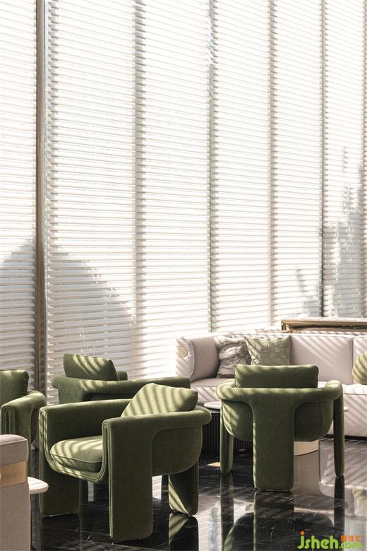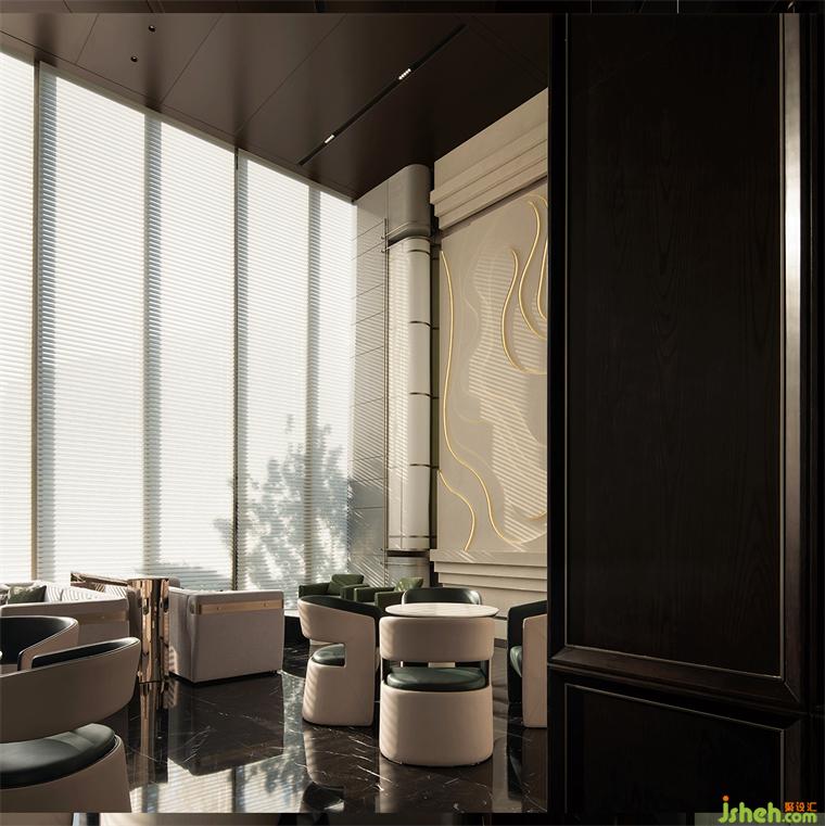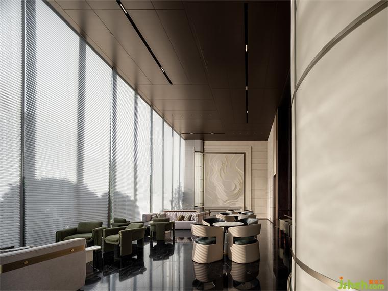 轉(zhuǎn)入開放式綜合洽談區(qū),高挑的屋面與整面條型窗將室外納入。售樓處設(shè)計沉入深棕色的水吧區(qū)將一塊西方古典主義的拼圖嵌入東方當(dāng)代生活,另一面則是與自然相融,松弛、優(yōu)雅、璀璨的現(xiàn)代生活,悠長時間線上的兩點碰撞出超越時間性的精神體驗。
