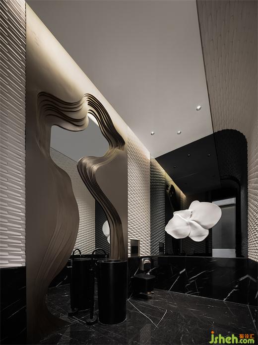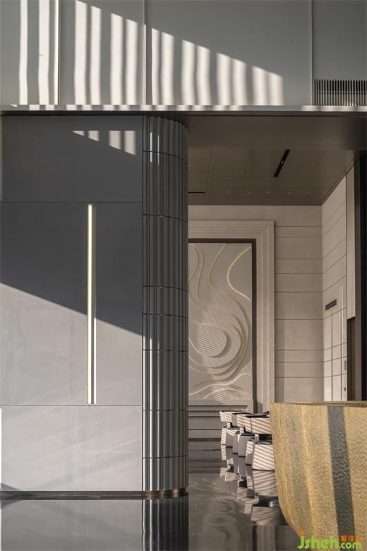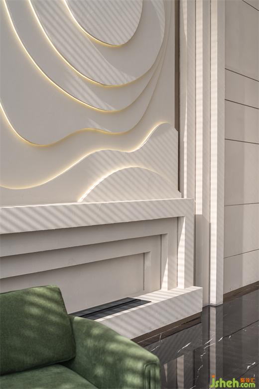 巨幅藝術(shù)裝置結(jié)合燈光營造出城市與土地的抽象概念,柔和的結(jié)構(gòu)線角又因為粗獷的材料肌理而平添無華質(zhì)樸,售樓處設(shè)計細(xì)膩的面料與金屬的光澤感彼此輝映,色彩則取法自然,與居住空間一體兩面——出則繁盛豐盈,入則隱匿自在;千變?nèi)f化、長住長新,都市生活與精神共棲。