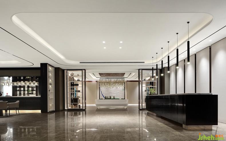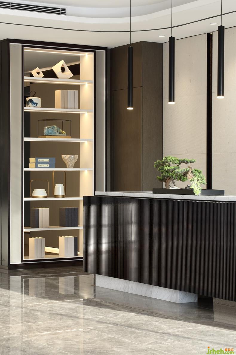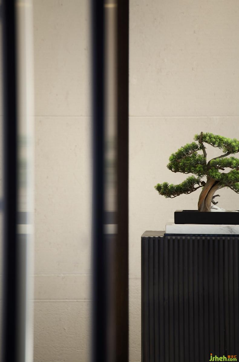 整體空間以面結(jié)合線的設(shè)計(jì)語(yǔ)言,貫穿始終,精致之余亦顯大氣,通過(guò)黑色金屬對(duì)不同材料進(jìn)行收口,與石、與木、或是皮革,有勾線之意,同時(shí)不同材質(zhì)總能碰撞出不一樣的火花。接待背景的石頭做了肌理面處理,仿佛訴說(shuō)著本該有的自然,眼前一株迎客松與之遙首相望,靜逸。