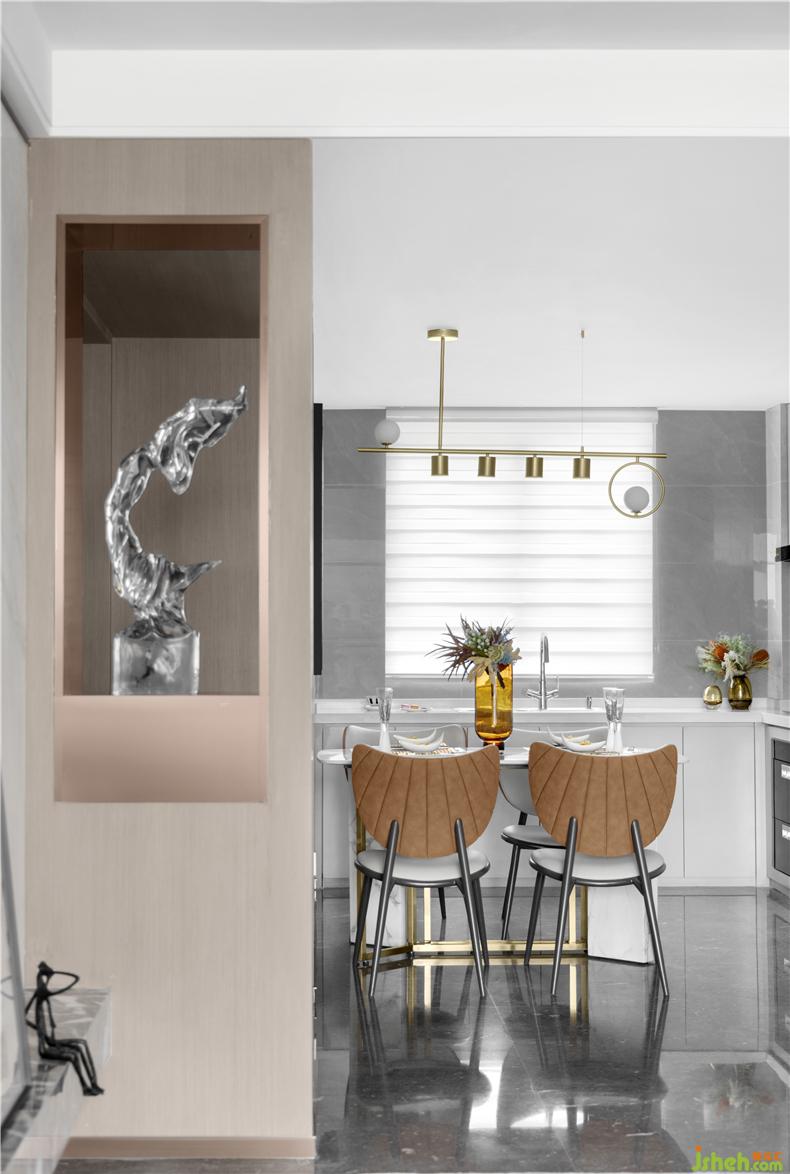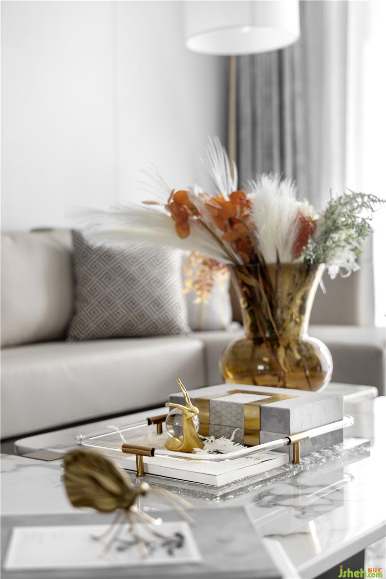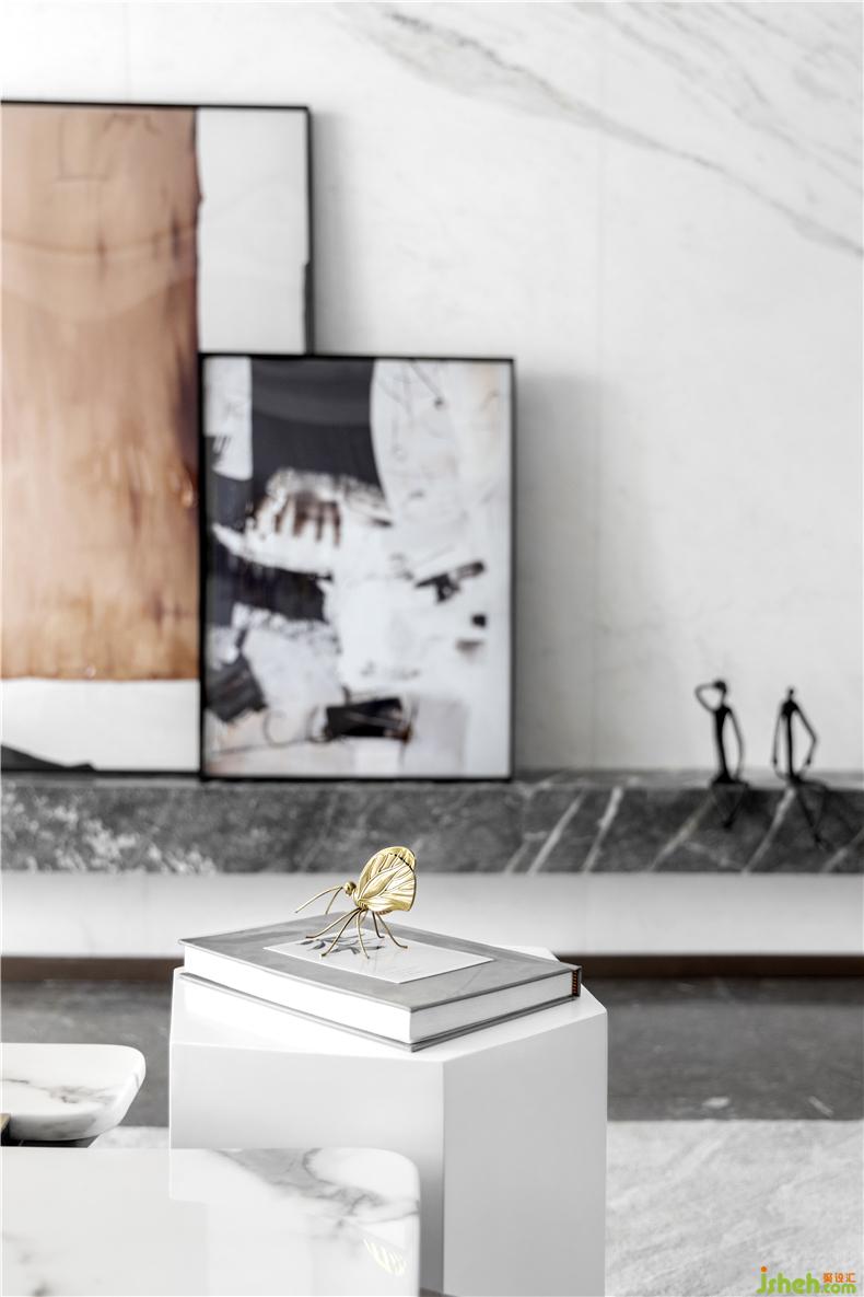 在這詩(shī)意之下,光滑的大理石映上清晨的冬日,增添了一份專屬的靜謐。素雅的空間色彩以及有序擺放的藝術(shù)擺件,在明亮的光線下慢慢浸潤(rùn)出質(zhì)感。樣板房設(shè)計(jì)