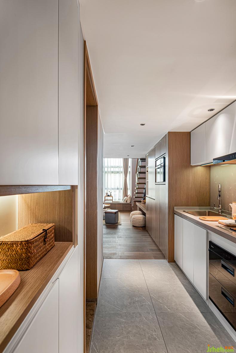 約4.5米的層高消除了空間的閉合感,木色沿著過道爬上地面和墻面,帶來秋天恬靜的氣息。樣板房設(shè)計(jì)籐編藝術(shù)吊燈與光的柔美結(jié)合,充分體現(xiàn)出自然材質(zhì)的美感