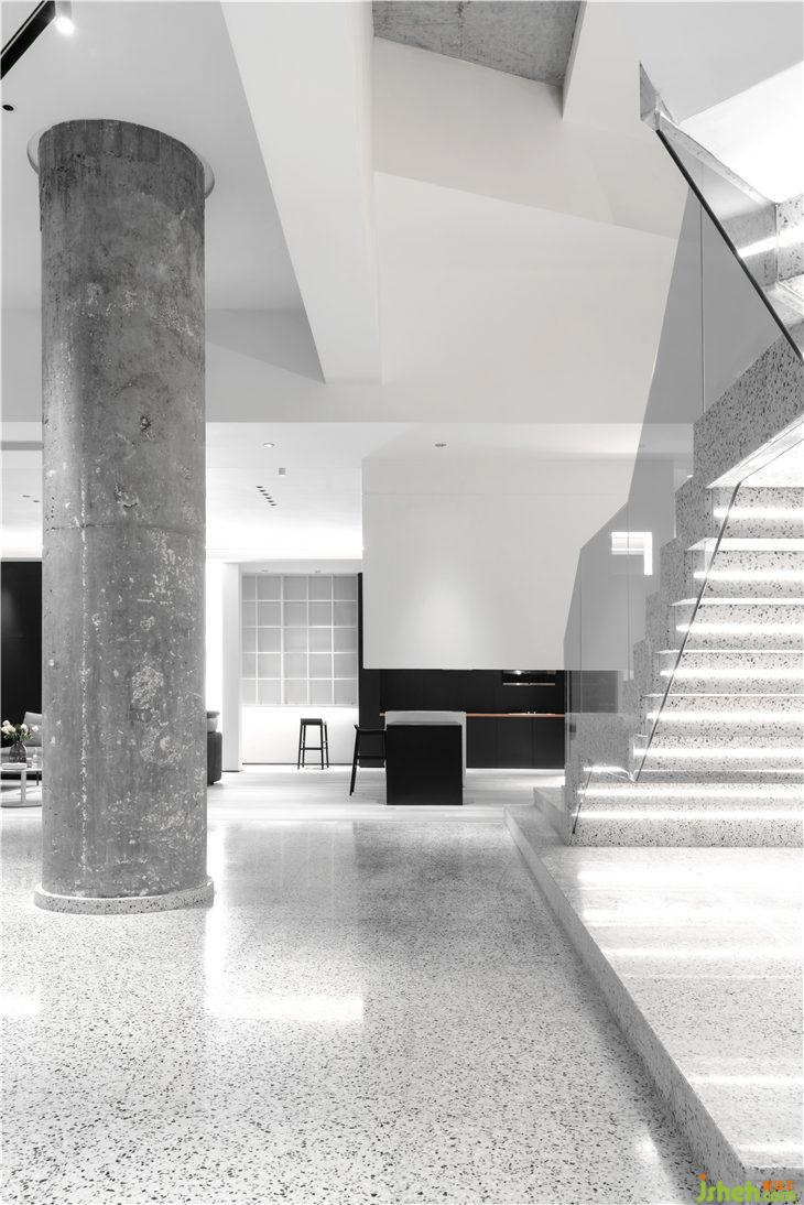 連接5.5米挑高的是一個(gè)33步的懸掛樓梯,樓梯平臺(tái)通過4次分割處理,讓每個(gè)平臺(tái)都一個(gè)獨(dú)立的視線框。樓梯的最后的視線墻是一個(gè)懸掛的半墻,透過半墻可以看到有一個(gè)長(zhǎng)形的黑色吧臺(tái)。也可以看到人從半墻后經(jīng)過的動(dòng)態(tài)。適當(dāng)?shù)膮^(qū)域劃分和安全感的設(shè)定在空間種是極其重要的。樓梯頂部的三角切割,原樓板的水泥面,原梁結(jié)構(gòu)的毛面處理,新筑的水泥漆吊頂。細(xì)膩與粗曠、整齊與不束、白與灰、原始與現(xiàn)代、一起在《有間》中關(guān)聯(lián)起來了。