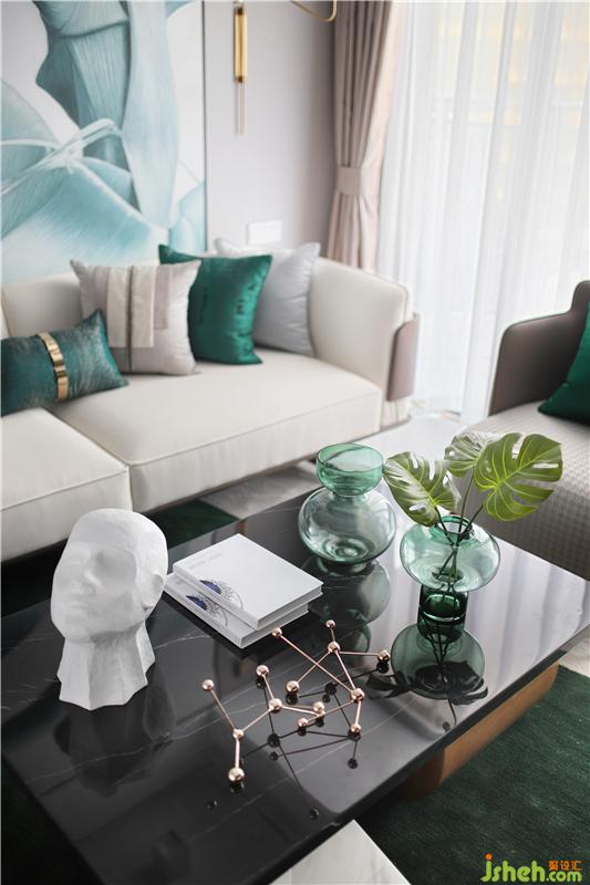 黑白灰基調(diào),祖母綠連貫整個(gè)客廳,落地靠畫加大了整個(gè)空間的體魄感,大氣又不失靈動(dòng),翩翩起舞,原形地毯色彩分割剛好延續(xù)著祖母綠,燈具剛好呼應(yīng)硬裝的不銹鋼金屬條,茶幾上的分子擺件也跟隨著,整個(gè)空間環(huán)環(huán)相扣,正是他們對(duì)待事物的一種態(tài)度;沒有多余的顏色,舒服就好。裝修公司