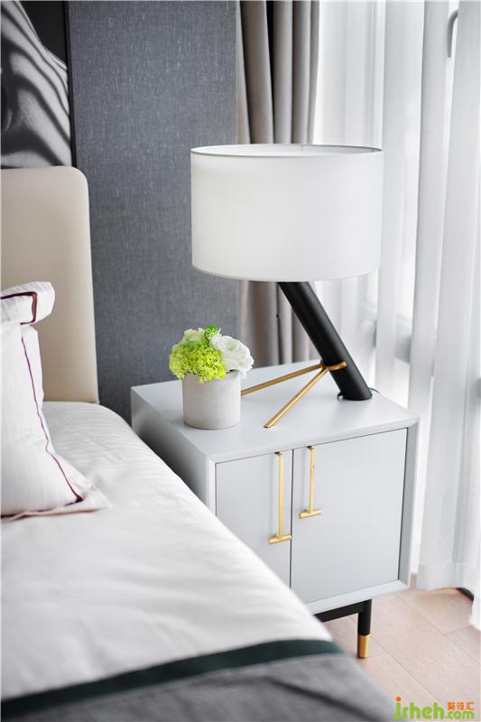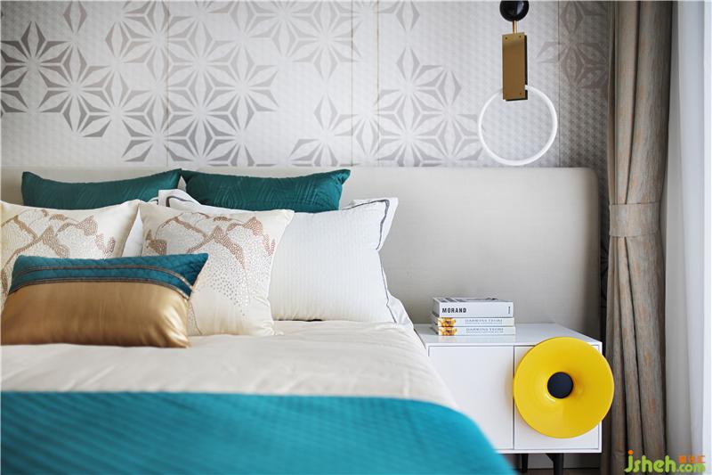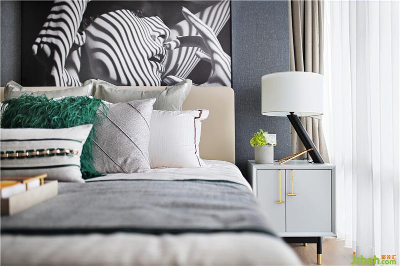 黑白灰的光影,暖暖的窗簾和床呼應(yīng),安靜溫暖的床,是小兩口最私密的空間,床頭是他們最愛的攝影作品,床上祖母綠流蘇抱枕正是女人柔美的象征。樣板房設(shè)計(jì)