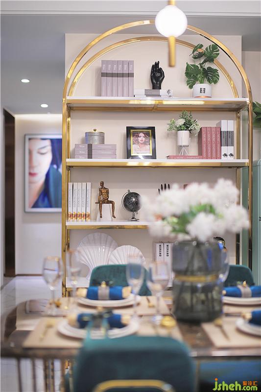 餐廳是一家人享受美食的地方,旁邊金色的裝飾書柜打破了這種唯一性,用完餐來一次餐后閱讀;你洗著碗,我等著你,溫馨的畫面讓人羨慕。裝修公司