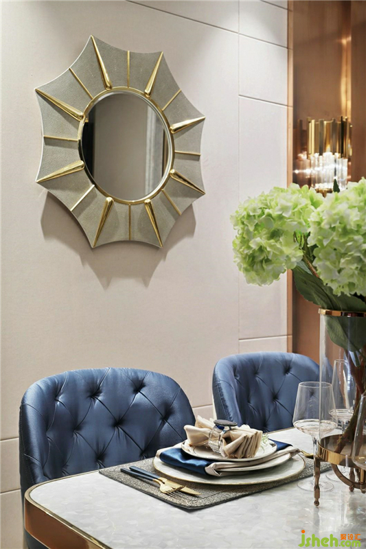 極具后現(xiàn)代主義風(fēng)格的太陽壁鏡極具藝術(shù)氣息,既改善了白墻帶給人的單調(diào)感受,增添了視覺層次,又讓餐廳空間得到了延伸,增添了靈動的視覺感受。