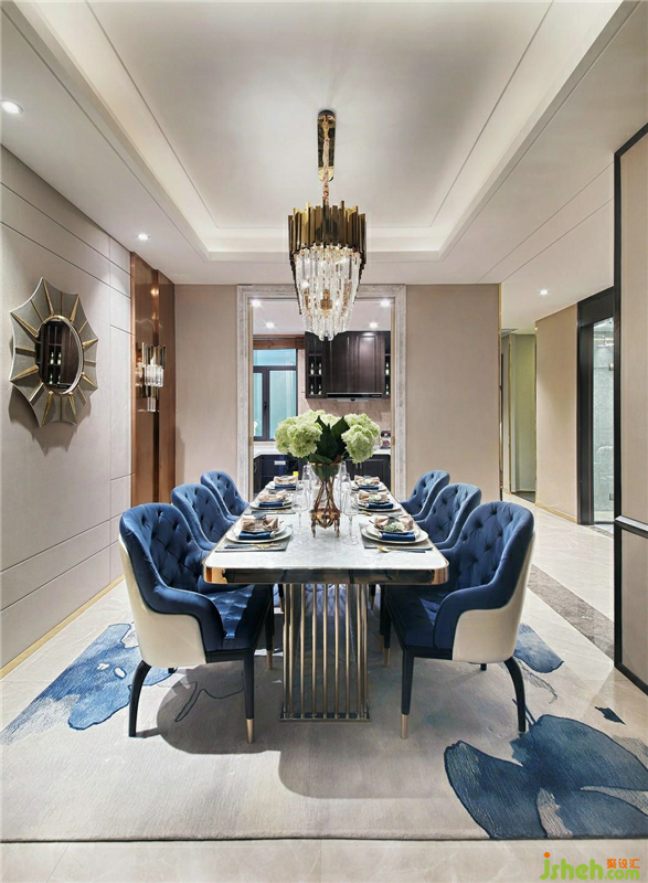 寶石藍(lán)的絲絨座椅色澤低調(diào)內(nèi)斂,造型古典而華美,設(shè)計線條柔和精致,弧線形的椅腿與直線型的餐桌支架相呼應(yīng),潔白細(xì)膩的餐廳桌面映襯淡雅的藍(lán)花地毯,餐廳空間奢華的風(fēng)格之中又巧妙添加一絲清新,相得益彰。