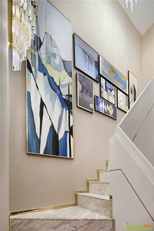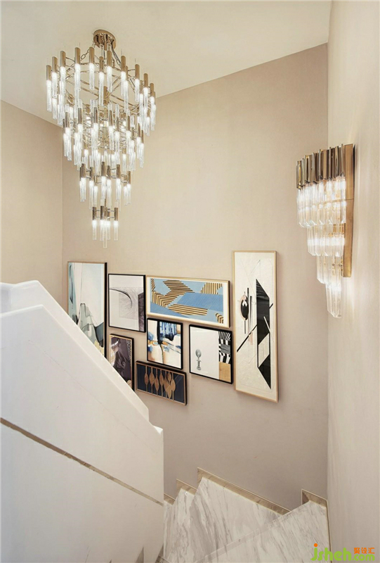 樓梯的照明采用吊燈與壁燈的組合光源,多層次多方位的光線讓樓梯的照明沒有一絲死角,溫和明亮的光線點(diǎn)亮樓道的每一個角落。金屬底座與水晶燈飾的搭配更增添了光線的朦朧之態(tài),圣潔而華美。