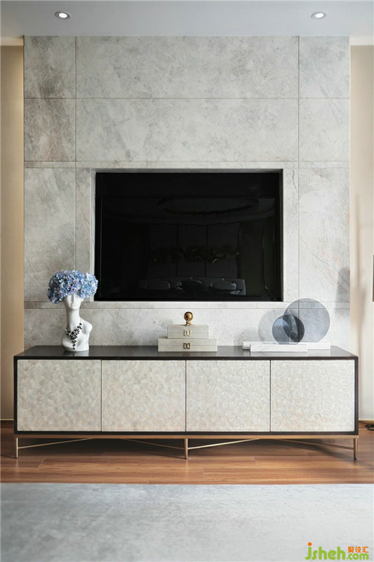 主臥的電視背景墻與客廳的電視背景墻采用了相似的設(shè)計(jì),二者遙相呼應(yīng),細(xì)膩的瓷磚質(zhì)感搭配粗獷的石紋圖樣,映襯著木紋地板與灰色的毛絨地毯的搭配,對(duì)比的沖突極富張力。