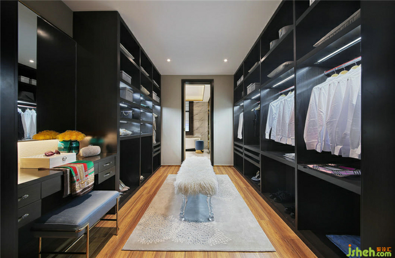 衣帽間黑白色調(diào)的強(qiáng)烈對(duì)比讓空間富有視覺層次感。潔白的墻面干凈整潔,頂上的內(nèi)嵌點(diǎn)射式光源讓室內(nèi)充斥著柔和的燈光,打造出一個(gè)溫和舒適的私人空間。
