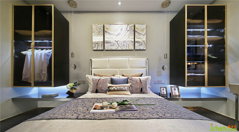 衣櫥采用壁掛的形式,為臥室節(jié)省了部分空間,設(shè)計(jì)精致。玻璃材質(zhì)的壁櫥更顯通透,讓衣柜看起來更有光澤度、更時(shí)尚,它融合時(shí)尚的現(xiàn)代類型和傳統(tǒng)裝飾,象征著主人的生活品味。