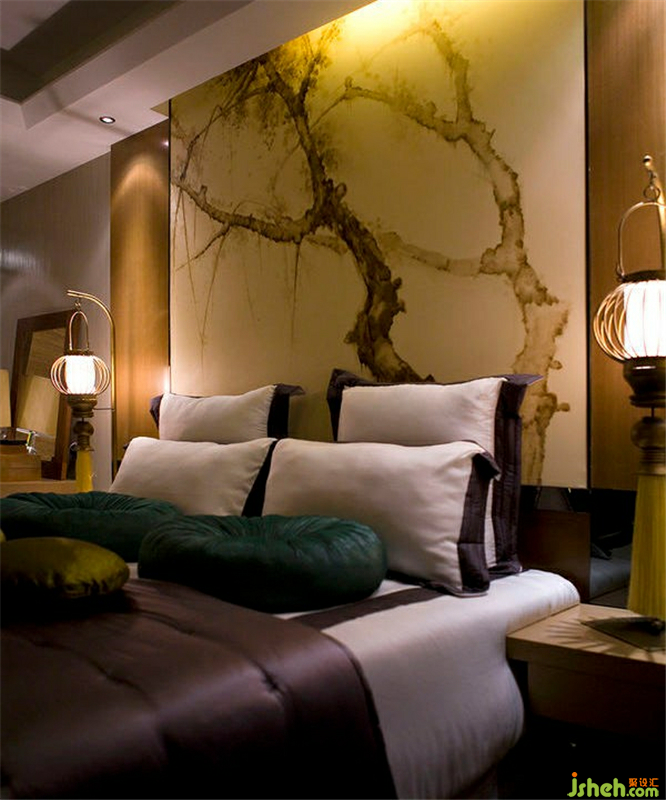 實(shí)物的立體掛畫(huà),帶有中式中式圖案紋樣的背枕。室內(nèi)設(shè)計(jì)師