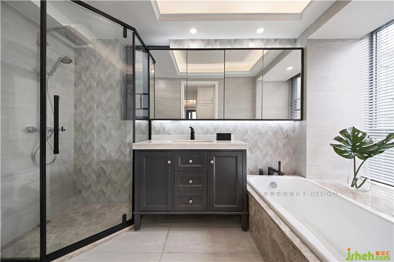 良好的采光,大塊面的鏡面,界面幾何磚的拼接,在視覺(jué)上延伸了空間感。主衛(wèi)收納空間充足,功能齊全,不同的材質(zhì)在色調(diào)上達(dá)成統(tǒng)一。裝修設(shè)計(jì)