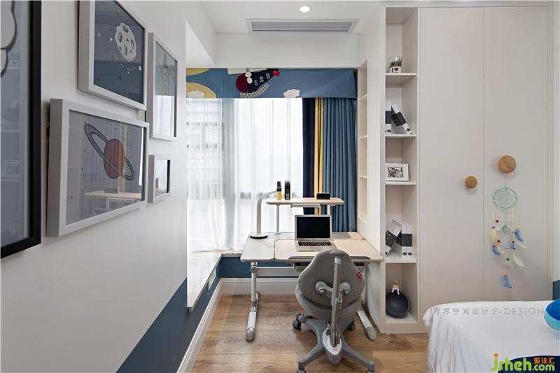 “鯨魚(yú)寶貝是媽媽在我剛出生的時(shí)候買(mǎi)給我的”,男孩跟我們開(kāi)心的分享。男孩房選用藍(lán)色作為主題色,藍(lán)色是大海的顏色,純凈,寬闊。男孩房沒(méi)有做太多的裝飾,墻面只是簡(jiǎn)單的幾何拼色,只有最單純的顏色才能喚起最強(qiáng)烈的心靈感受。