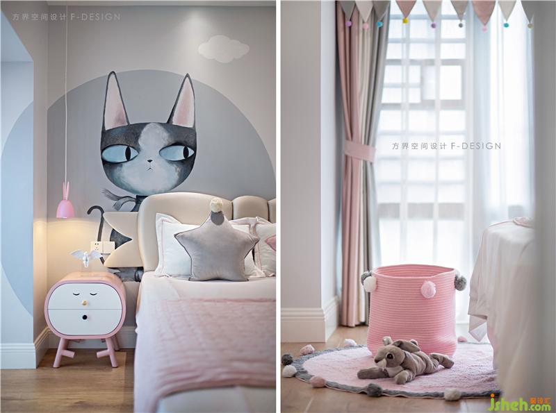 女孩子天生就很喜歡粉色。我們在原本灰色的格調中加了點粉色的元素,卡通貓咪的床頭背景墻成為點睛之筆,令空間瞬間有了童稚的感覺。童年該有的甜美和純真在女孩房展現(xiàn)得淋漓盡致,溫柔粉加上高級灰的搭配,做一個香甜溫柔的夢吧。裝修設計