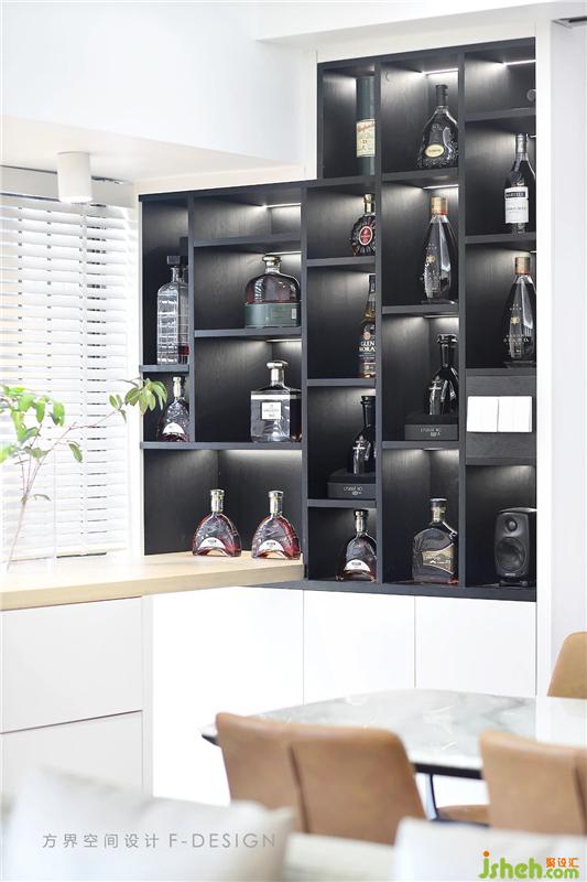 與原始結構巧妙結合,于餐廳一角布置吧臺與酒柜。男主人公愛酒,藏酒豐富。閑暇時的小酌一杯比之酩酊大醉更有情調,于吧臺半醉半醒間細數光陰。