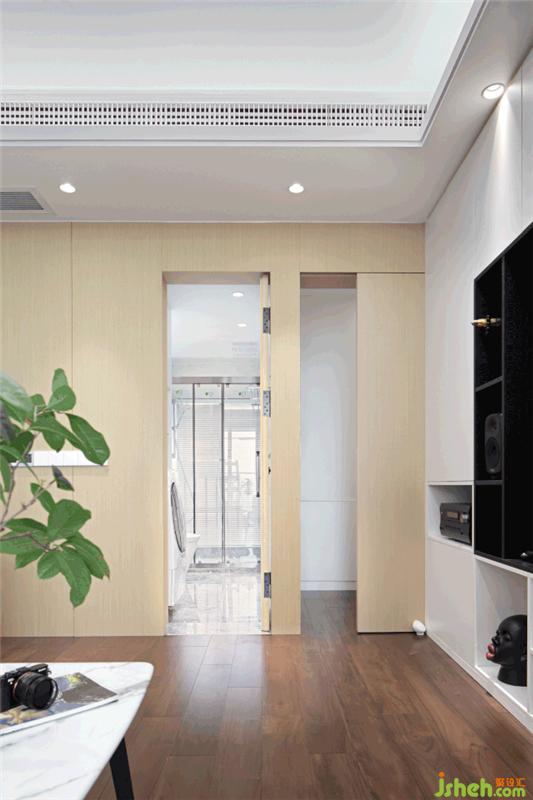 隱藏在木隔墻上的隱形門是通往臥室和衛(wèi)生間,把空間隱藏起來,不僅美觀,使墻面看起來更整體,同時提高私密性,讓空間得到延伸。