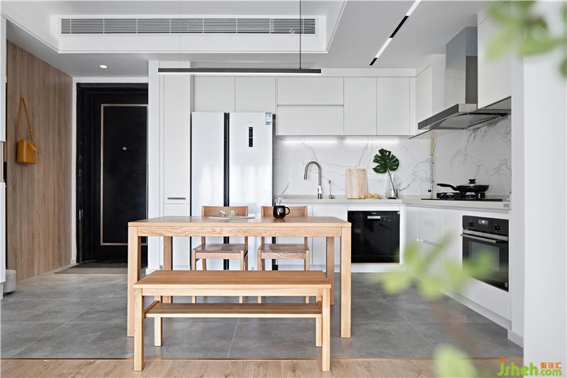 開放式廚房,材質(zhì)上的軟硬對(duì)比,寬敞的空間,干凈的墻壁,白色的櫥柜,整體干干凈凈,使這個(gè)廚房簡(jiǎn)約,而又不簡(jiǎn)單。