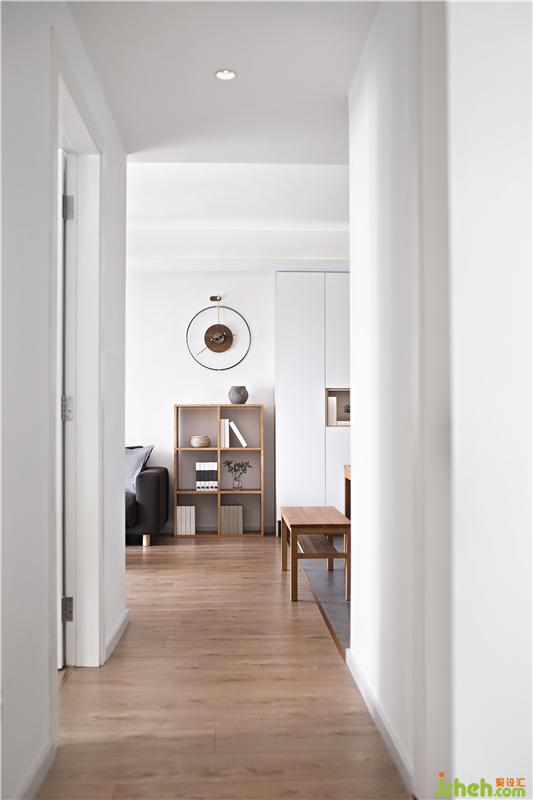 主臥與衛(wèi)生間之間的過道看向客廳。過道也延續(xù)了整體空間的色調(diào),素白的墻面,極簡(jiǎn)的掛鐘,與整體氛圍搭配十分和諧,空間層次豐富起來。