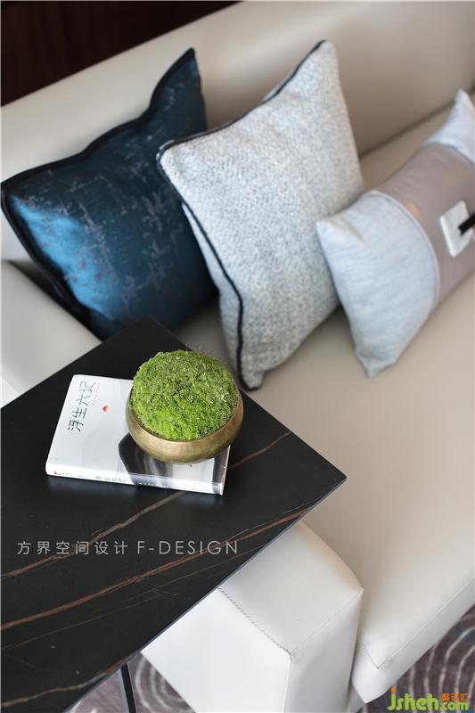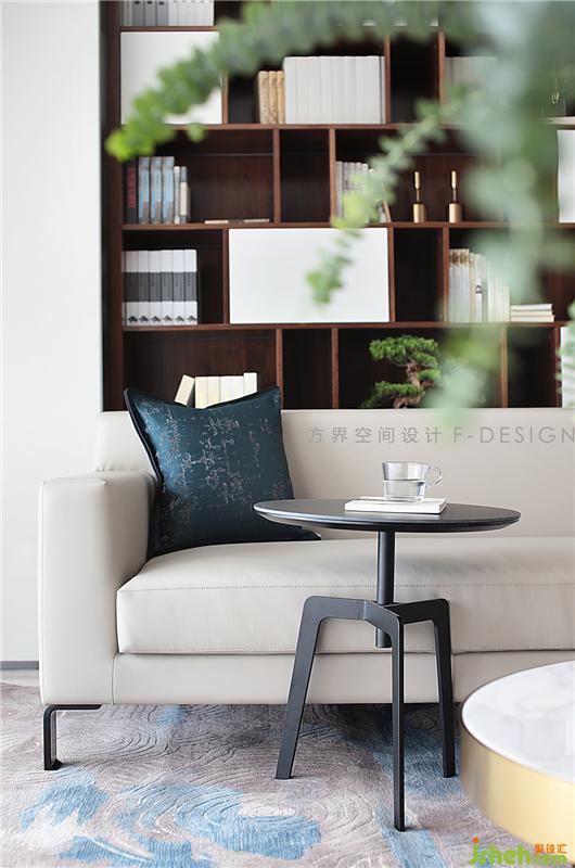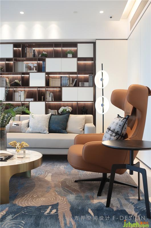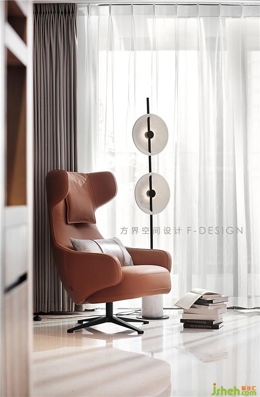 而旁選用一盞落地?zé)糇鳛檠b飾,旁邊的橘色單人沙發(fā)椅也在空間中添了一抹色彩,豐富了空間的視覺(jué)效果。