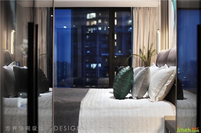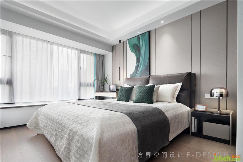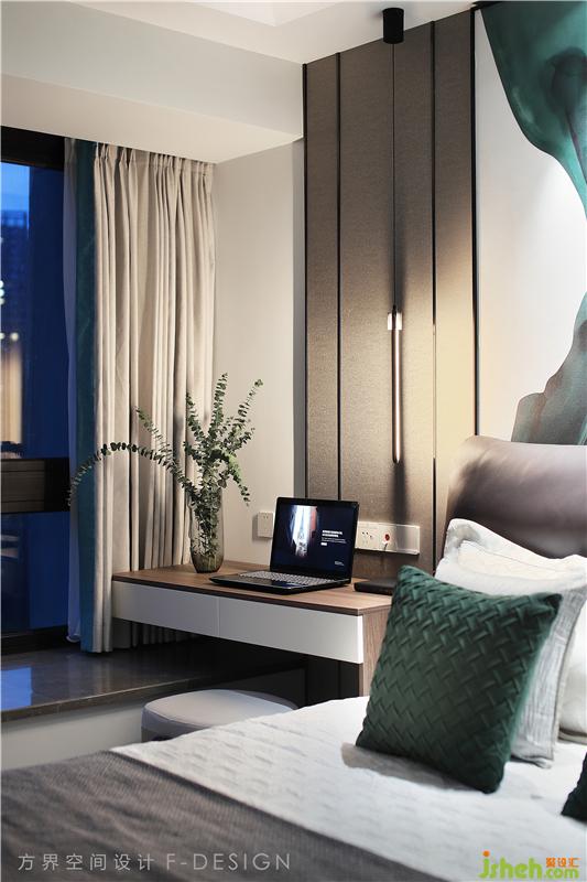 主臥用深淺色調(diào)搭配,彌漫著靜謐安寧的氛圍,沉靜理性,給業(yè)主休憩提供了安靜的環(huán)境。床頭靠背的一幅墨綠色裝飾畫,亦為空間增添一抹亮色。