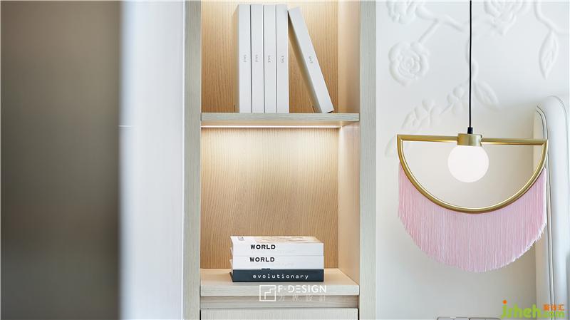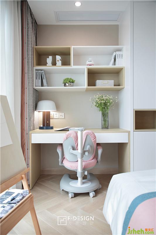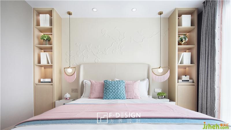 女孩房,床頭背景墻硬包雕花紋造型;床頭兩側(cè)擺放的淺色系儲(chǔ)物柜,既是在滿足實(shí)用需求的同時(shí),也使空間與其融為了一體。