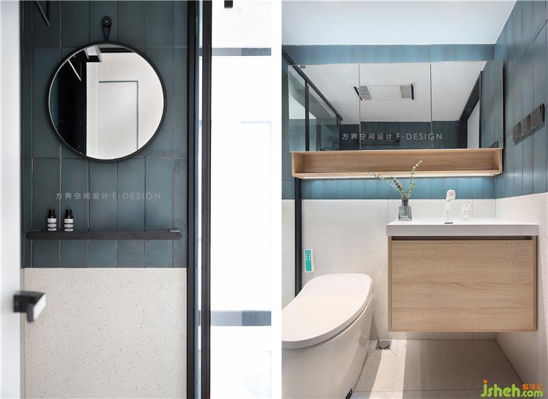 長(zhǎng)條方形藝術(shù)磚搭配水磨石,上方設(shè)計(jì)了一整面的鏡柜,底下的儲(chǔ)物空間,即滿足了收納需求,也顯得衛(wèi)生間干凈整潔。