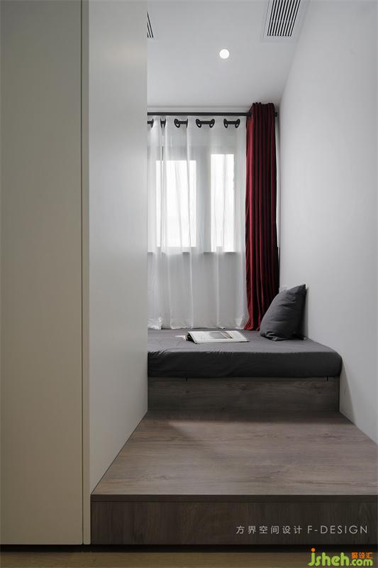 之前的書房融進(jìn)了臥室里,這個(gè)空間采取榻榻米設(shè)計(jì)。榻榻米的設(shè)計(jì)使空間變得多功能用途。原來的圍墻做成了L型衣柜,圍起來的空間滿滿的安全感。