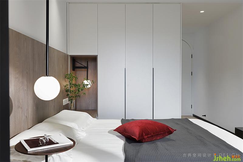 床頭背景墻一半用原木拼接平實(shí)而雅致,在純粹的素色中跳用深紅色點(diǎn)綴,顯盡輕松休閑簡約明靜。