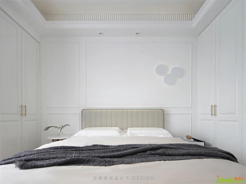 床頭背景的的分割方式,床靠背為分割線上下左右分割,臥室的左右兩邊都設(shè)計(jì)有柜子,左手邊是儲(chǔ)物柜,右邊是衣柜,滿足了儲(chǔ)物功能。