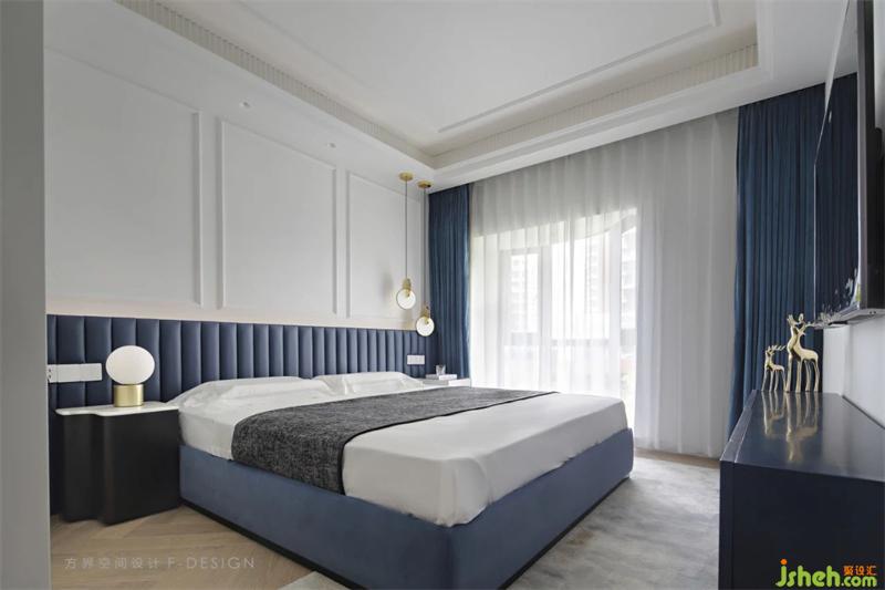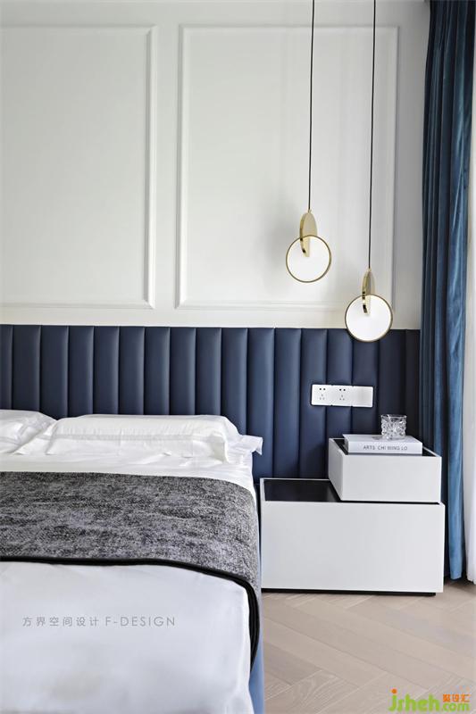 主臥室空間,線條分割以床背景高度為分界,用PU線條平均劃分墻面,采用藍(lán)色色調(diào)來表現(xiàn)空間。