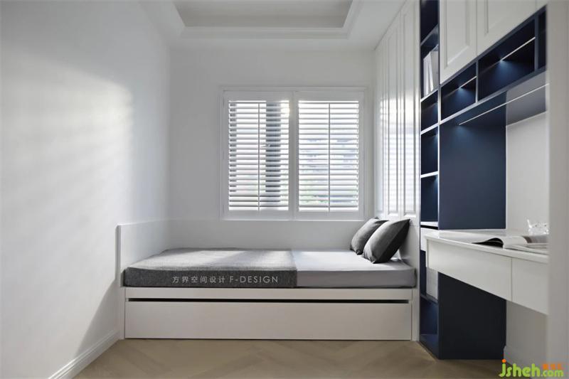 這個臥室的窗戶,沒有用常規(guī)的布藝窗簾,是采用了空氣窗??諝獯笆强梢哉{(diào)節(jié)角度的,關(guān)起來也可以起到遮光的作用。