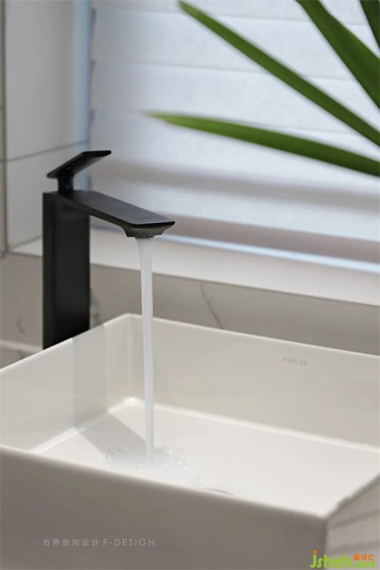 洗手臺的龍頭采用墻出龍頭,整體設(shè)計會更加干凈,美觀。黑色的龍頭和淋浴隔斷呼應(yīng)。