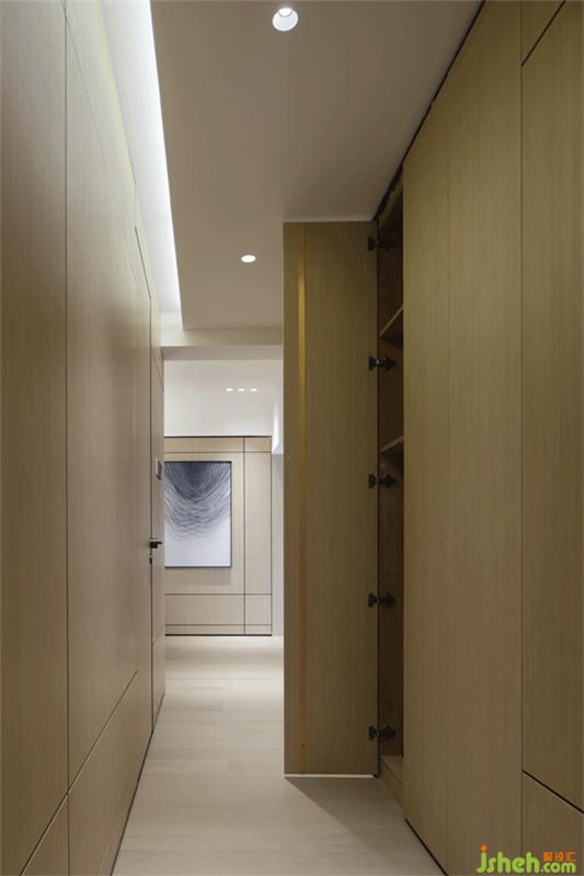 原木的搭配高級(jí)質(zhì)感又溫柔雅致。在筒燈的基礎(chǔ)上旁邊再加一排反燈槽保證走廊的光線(xiàn)。