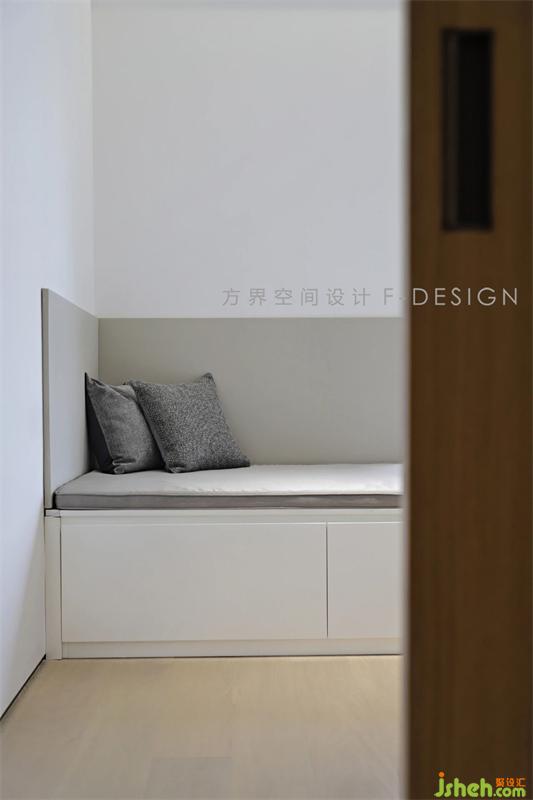 走廊內(nèi)推一點(diǎn)空間做了隱形的生活收納柜,回彈的柜門(mén)使走廊為一整體一面墻 。