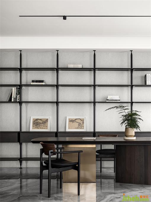 墨色肌理的大理石墻面,惠州私宅設(shè)計(jì)搭配木質(zhì)錯(cuò)落的置物架,奔放且不失秩序感。