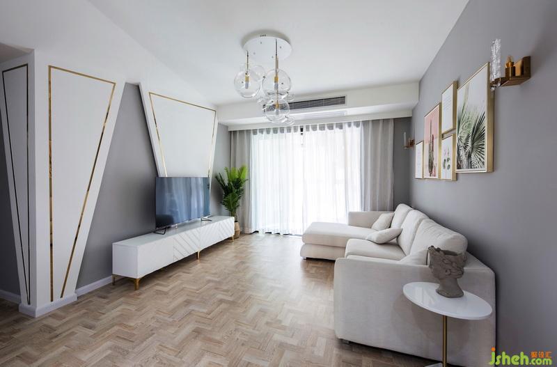 電視背景-分明的灰色和白色配上利落的三角形造型,點綴金色的金屬條,帶入些許科技感,再配上綠植,使空間清新自然,就好像在炎熱夏日里的一處清涼。